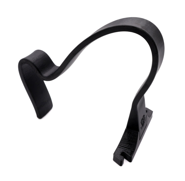 - Black plastic handle form; long, wavy handle with small S curve at bottom