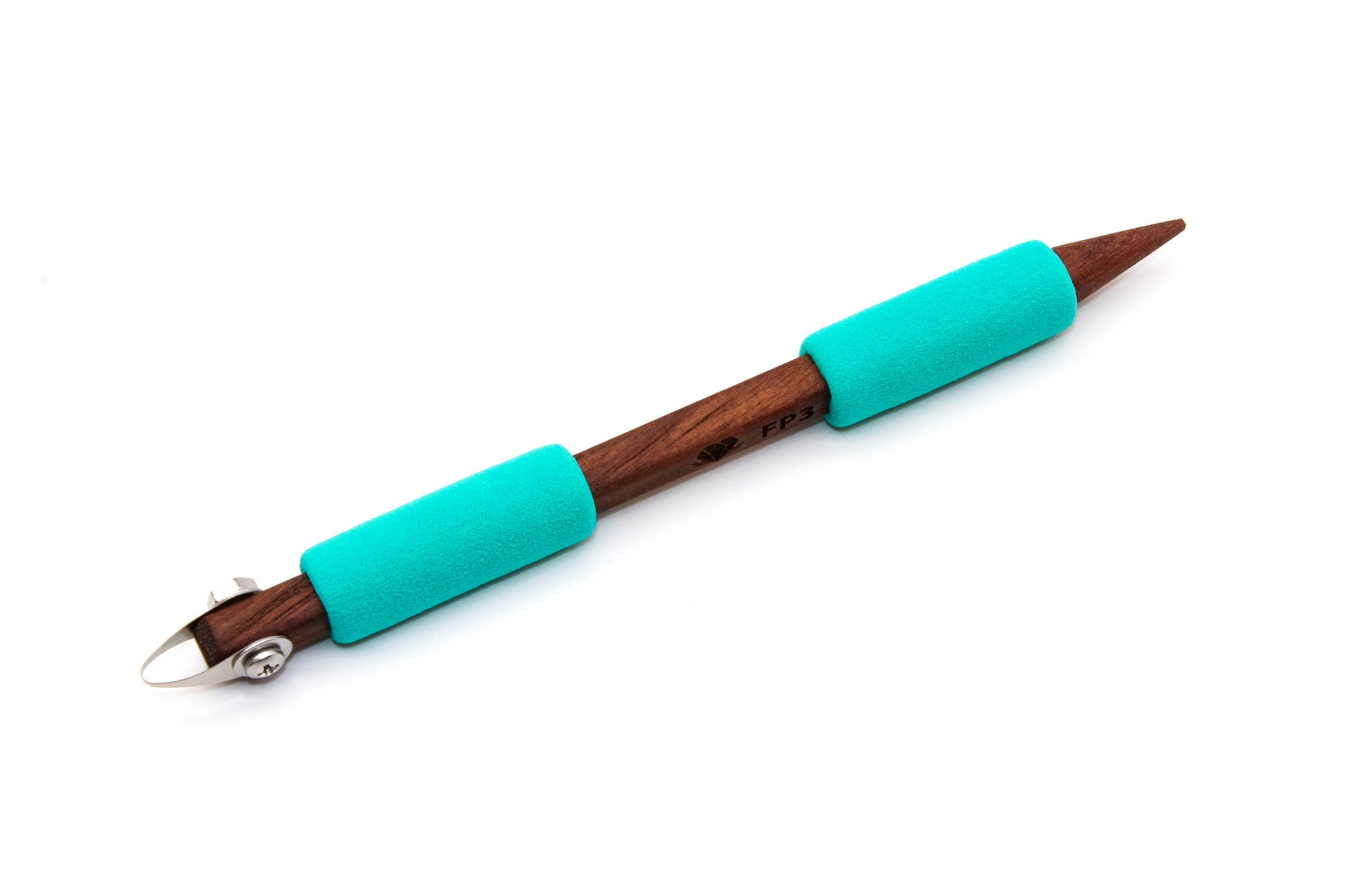Fans of our original PF3 tool know it's a must-have for any ceramic artist's toolbox. Our newly updated FP3 Fine Point U Tip keeps the same blade as our former PF3 but now comes with an additional grip to ease hand fatigue during intense carving sessions. This 3 mm U-shaped tip is still ideal for fine, detailed sgraffito and for navigating small, difficult-to-reach places. With its sharp, replaceable blade; innovative design; and beautiful hardwood handle; this tool is far superior to other sgraffito wire tools.